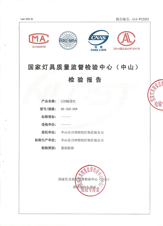 熱烈祝賀月神照明LED隧道燈產(chǎn)品通過(guò)國(guó)家燈具質(zhì)量監(jiān)督檢驗(yàn)中心檢測(cè)并頒發(fā)權(quán)威檢驗(yàn)報(bào)告,本檢驗(yàn)報(bào)告是國(guó)內(nèi)LED隧道燈市場(chǎng)的敲門(mén)磚,是LED隧道燈質(zhì)量的保證,是信譽(yù)的結(jié)晶,更是對(duì)客戶采購(gòu)LED隧道燈產(chǎn)品時(shí)對(duì)質(zhì)量的確保。